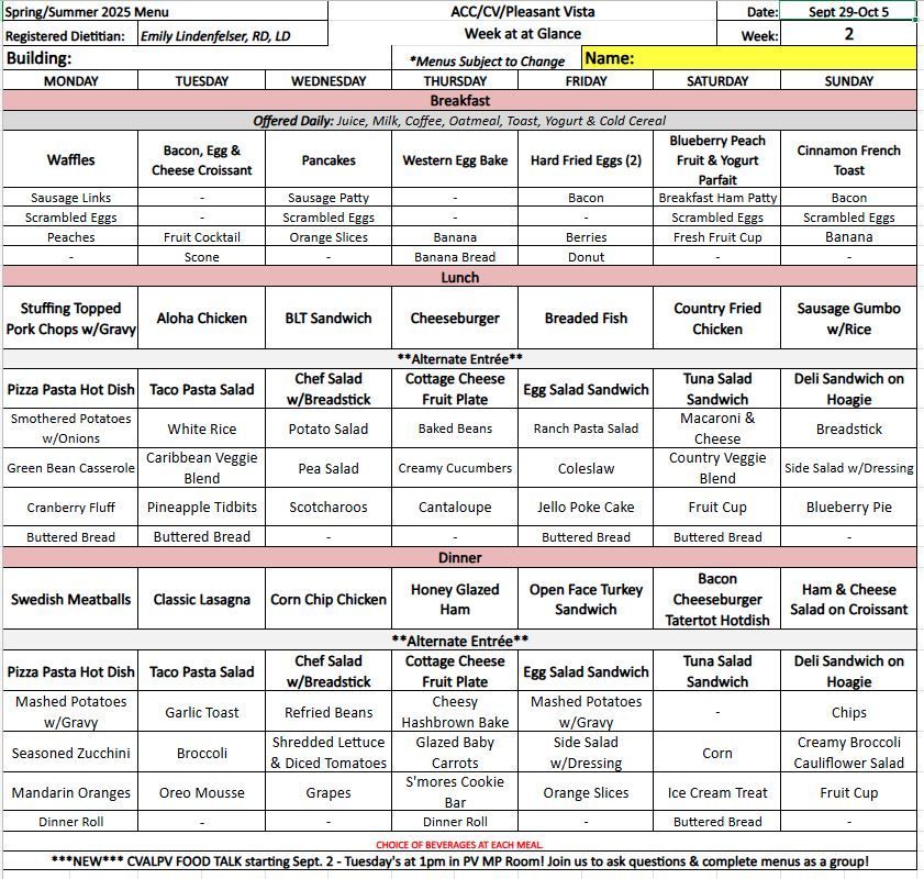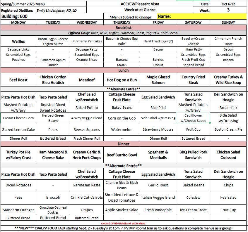 Our Culinary Department provides fresh, delicious meals available three times a day. Our menu changes each season with a lot of variety to satisfy your needs!